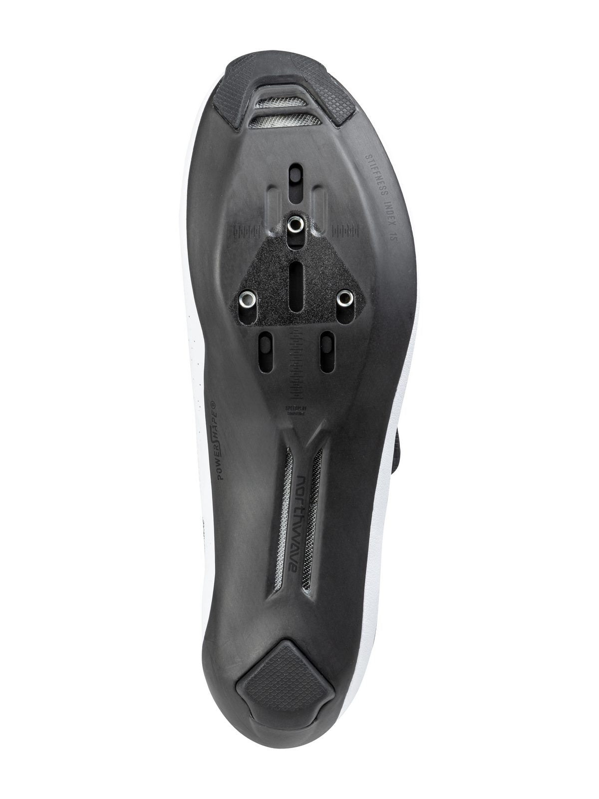 Jednolita carbonowa podeszwa z indeksem sztywności wynoszącym aż 15 zapewnia optymalny transfer mocy na pedały, dzięki ekskluzywnej konstrukcji high tail i opatentowanemu systemowi Powershape. Tylnie kołki z gumy można wymieniać, co wydłuża żywotność butów. Duże otwory wentylacyjne sprzyjają przepływowi powietrza zarówno do wnętrza, jak i na zewnątrz.